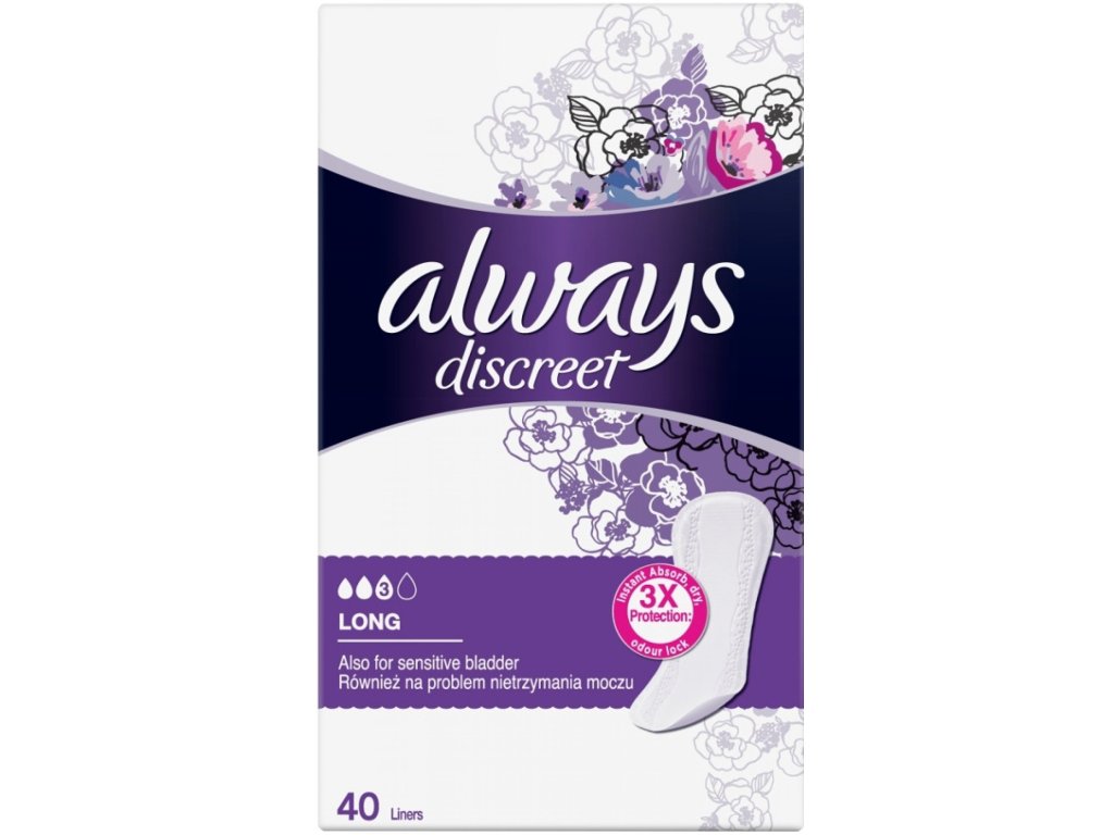 Vyzkoušejte produkt Always Discreet Intimky Long s balením obsahujícím 40 ks. Jsou ideální pro ty okamžiky, kdy potřebujete navíc trochu ochrany. Tyto inkontinenční intimky byly speciálně navrženy tak, aby vám poskytly svěžest a jistotu bez ohledu na situaci. Díky technologii neutralizace zápachu můžete být naprosto klidní a spolehnout se na jejich účinnost. Dopřejte si výjimečnou péči o svůj citlivý močový měchýř a zažijte pocit komfortu s intimkami Always Discreet.