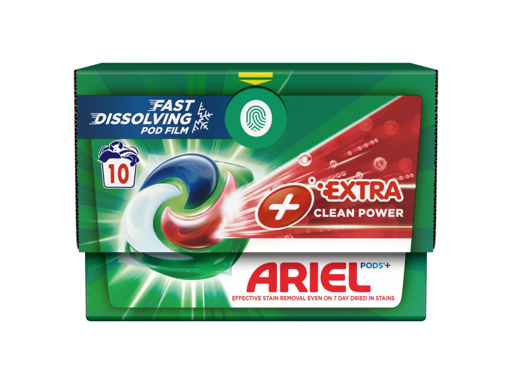 Tento gelový prací prostředek je určený na všechny typy barevného prádla, přičemž si poradí s mastnotou, potem i zaschlými skvrnami. Díky rozpustnému obalu a možnosti prát i při nižších teplotách pomáhá šetřit energii. Prací kapsle ARIEL All-in-1 PODS Extra Clean jsou navíc baleny do recyklovatelné kartonové krabičky ECOCLIC, která obsahuje pouze minimum plastu.