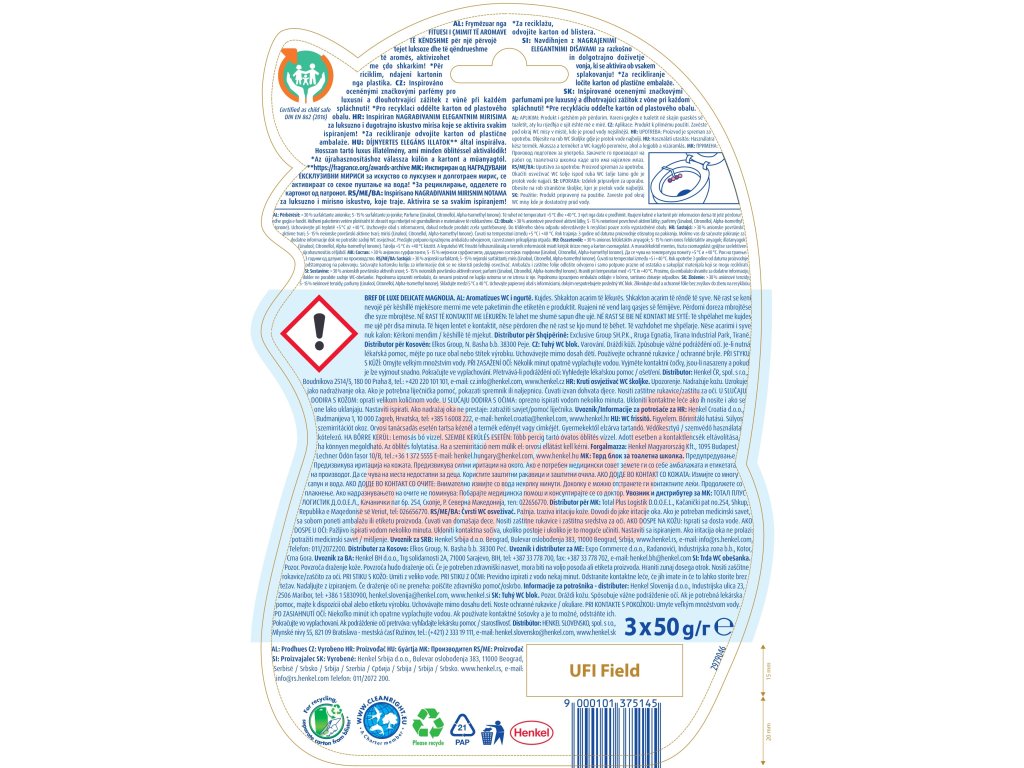 BREF DeLuxe je tuhý WC blok s elegantní vůní inspirovanou prémiovými parfémy, který promění každé spláchnutí v zážitek plný čistoty a svěžesti. Díky účinnému složení se 4 funkcemi vytváří aktivní čisticí pěnu, pomáhá zabraňovat usazování vodního kamene a nečistot, a zároveň dodává dlouhotrvající vůni celé koupelně. Praktické balení obsahuje tři WC bloky, které snadno zavěsíte pod okraj toalety.