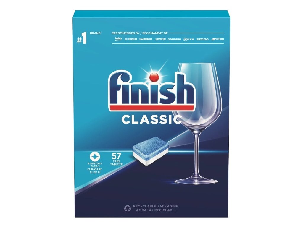FINISH Classic Regular jsou tablety do myčky nádobí určené pro každodenní mytí nádobí. Účinně odmočí a změkčí zaschlé zbytky jídla a pomáhají odstranit i odolné nečistoty, včetně čajových skvrn. Aktivní čisticí složky si poradí s mastnotou, připáleninami i běžným znečištěním a zanechají nádobí čisté a lesklé. Tablety do myčky jsou vhodné pro běžné programy domácích myček nádobí a lze je používat při každodenním provozu domácnosti. Pro dosažení optimálních výsledků se doporučuje kombinovat s regenerační solí a leštidlem do myčky.