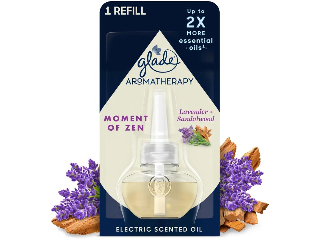Náplň do elektrického osvěžovače vzduchu GLADE Aromatherapy Moment of Zen přináší do vašeho domova harmonii a klid díky přírodní vůni levandule a australského santalového dřeva. Tato pečlivě vybraná směs esenciálních olejů vytváří atmosféru uvolnění a pohody, ideální pro večerní relaxaci nebo zklidnění mysli po náročném dni. Náplň je určena pro elektrické osvěžovače vzduchu Glade Aromatherapy i Glade Electric a vydrží až 100 dní při používání na nízkou intenzitu. Výrobek je bez parabenů, ftalátů, umělého pižma a přidaných barviv. Obal je plně recyklovatelný, vyrobený ze 100% recyklovaného papíru. Unikátní keramický nahřívač zajišťuje rovnoměrné uvolňování vůně, která pozvolna a přirozeně prostupuje celým prostorem. Vhodný i do větších místností.