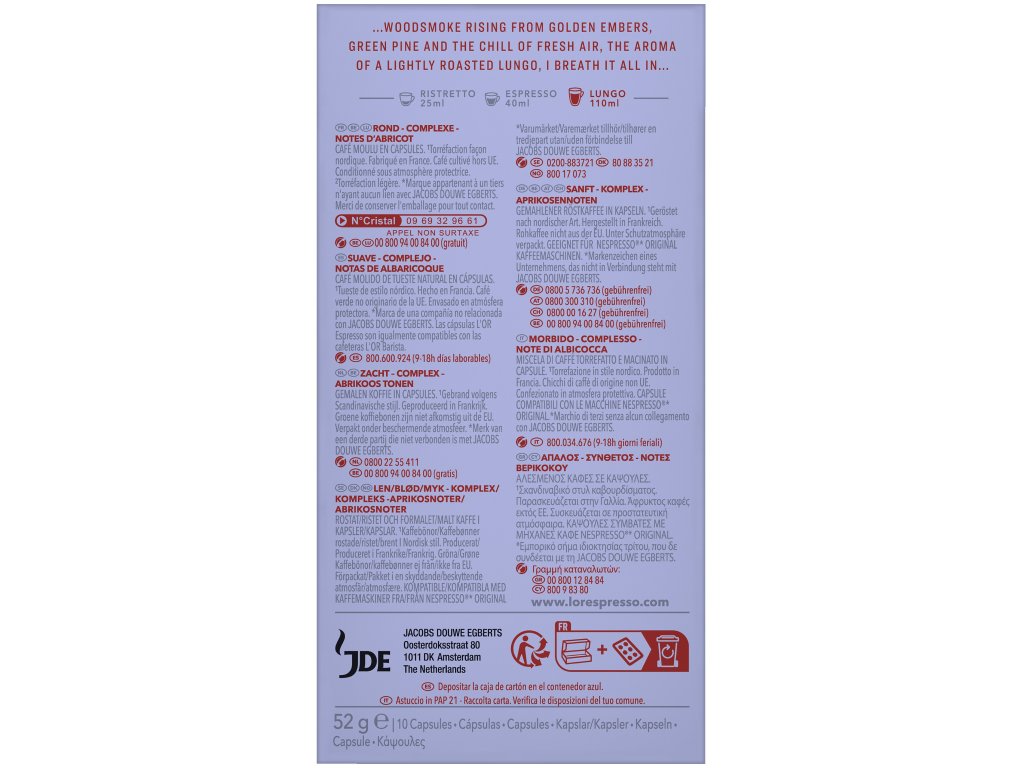 L’OR Espresso Scandinavian je jemně pražená káva 100% arabika vytvořená pro delší šálek typu lungo. Nabízí vyvážený a přitom komplexní chuťový profil, ve kterém se spojuje jemné aroma karamelu a máslových sušenek s ovocnými tóny meruněk a nádechem toffee.