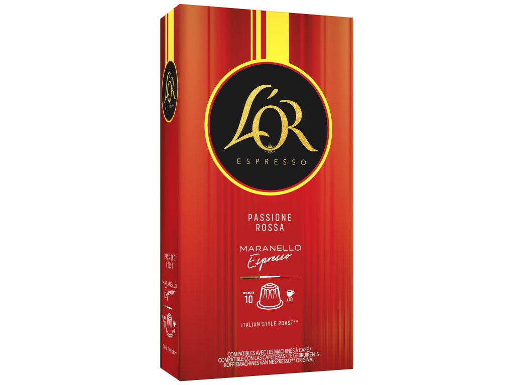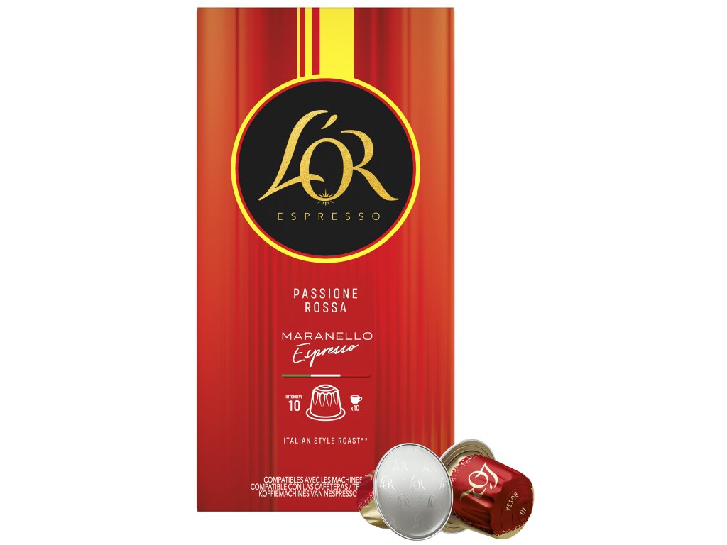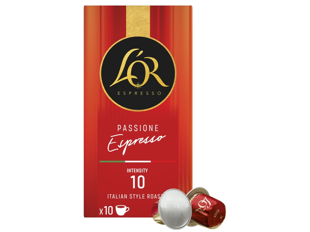 L’OR Passione Espresso jsou prémiové kávové kapsle s intenzivní, přesto harmonicky vyváženou chutí, určené pro milovníky espressa z Nespresso®* Original kávovarů. Pražená mletá káva arabika v hliníkových kapslích nabízí bohatý, elegantní chuťový profil, ve kterém se postupně rozvíjejí tóny červených bobulí a hořké čokolády. Italský styl pražení zvýrazňuje plnost, intenzitu a jemnou hořkost v dochuti, zatímco vysoká intenzita 10 ze 14 poskytuje výrazný, ale stále vyvážený kávový zážitek. Každá kapsle je přesně nadávkovaná pro přípravu kvalitního espressa, díky čemuž je příprava kávy rychlá, čistá a pohodlná.