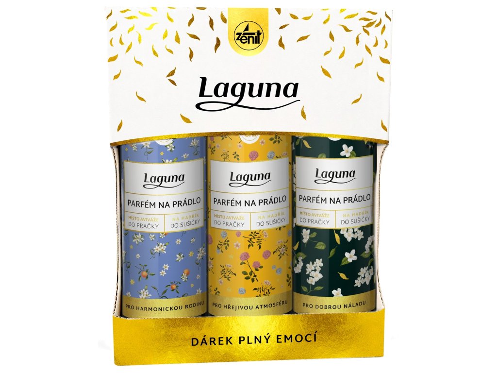 Dárkový balíček LAGUNA Rodina spojuje tři vůně, které navodí pocit domova, harmonie a radosti. Každý parfém je koncentrovaný, a proto zajišťuje dlouhotrvající svěžest prádla bez narušení vlastností tkanin.