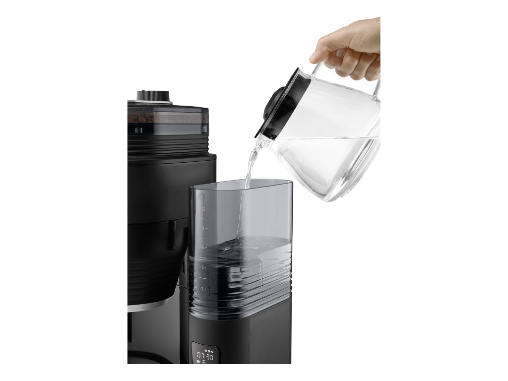 Design kombinuje matně černé prvky se skleněnou konvicí, díky čemuž se hodí do všech kuchyní. Výška 463 mm umožňuje pohodlné doplňování vody i kávy shora.