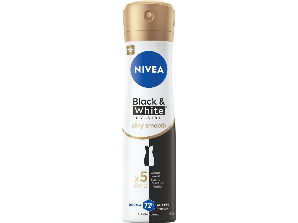 NIVEA Black & White Invisible Silky Smooth je antiperspirant navržený pro spolehlivou 72hodinovou ochranu před potem a zápachem, a zároveň pro mimořádně jemnou péči o pokožku podpaží. Díky technologii Derma Active chrání i citlivou pokožku a je vhodný k použití ihned po holení.