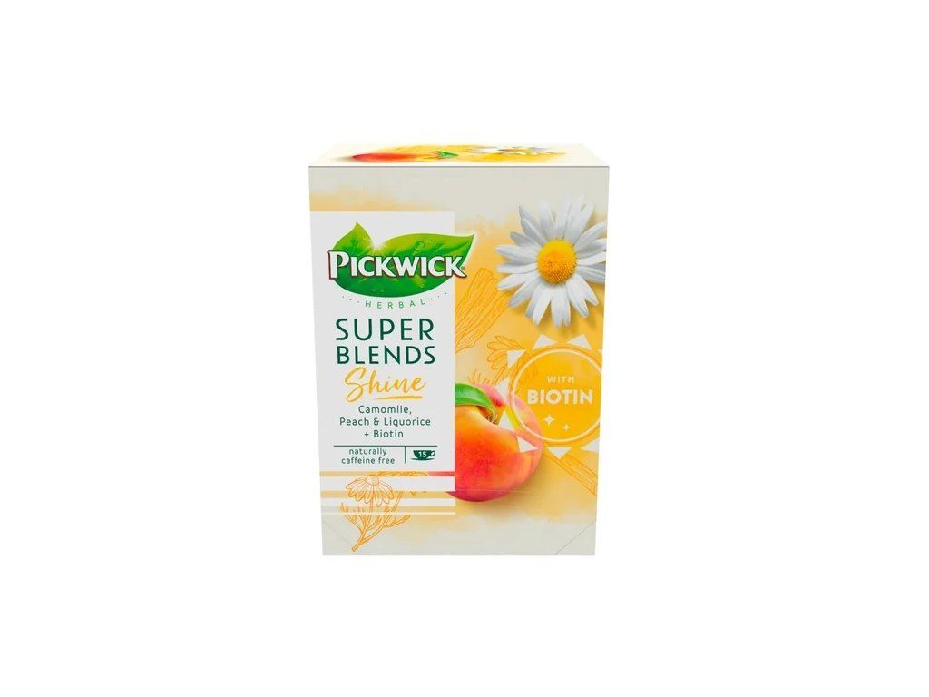 PICKWICK Super Blends Shine je aromatizovaný porcovaný čaj s kombinací heřmánku, lékořice a broskve, doplněný o biotin. Základ tvoří heřmánek, který nálevu dodává jemnou květinovou chuť a příjemné aroma. Sladké tóny broskve se přirozeně doplňují s lehce nasládlým charakterem lékořice, díky čemuž působí chuť vyváženě a harmonicky.