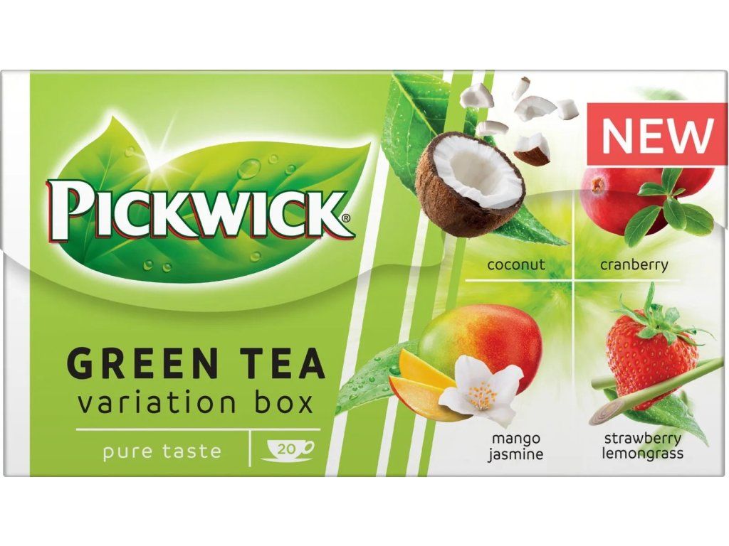 PICKWICK Zelený čaj variace s ovocem je porcovaný čajový set, který nabízí čtyři různé kombinace zeleného čaje s ovocem a dalšími ingrediencemi. V balení najdete varianty s brusinkou, kokosem, jahodou s citronovou trávou a jasmínem s mangem. Každá směs přináší odlišný chuťový profil – od jemně ovocných tónů přes svěží citrusové nuance až po lehce exotické kombinace.