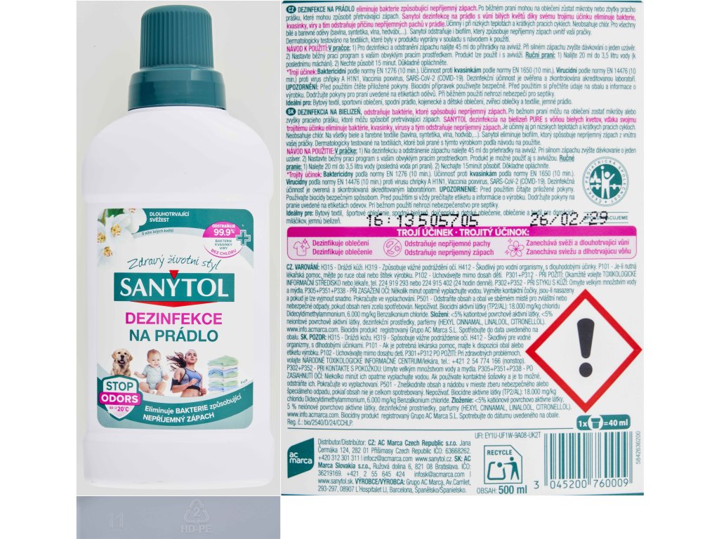 Dezinfekce na prádlo bílé květy značky SANYTOL představuje spolehlivé řešení pro hygienické praní i při nízkých teplotách. Účinně odstraňuje 99,9 % bakterií, plísní a virů, včetně lidského koronaviru 229E a viru chřipky A (H1N1). Díky technologii STOP ODORS eliminuje zápach přímo u zdroje a zabraňuje jeho návratu, a to i uvnitř pračky. Dezinfekce je vhodná pro bílé i barevné prádlo, přičemž je šetrná k vláknům i barvám. Zanechává dlouhotrvající svěží vůni bílých květů a neobsahuje chlór, což je výhodné jak pro textil, tak pro domácnost. Skvěle se hodí na spodní prádlo, sportovní oblečení, dětské oblečení, ručníky nebo textil, který přichází do kontaktu s domácími mazlíčky.