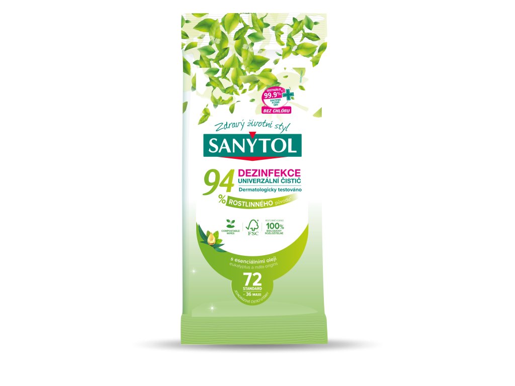 SANYTOL Dezinfekční univerzální čisticí utěrky 94 % rostlinného původu eukalyptus a máta 72 ks