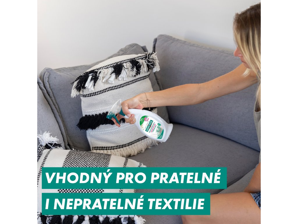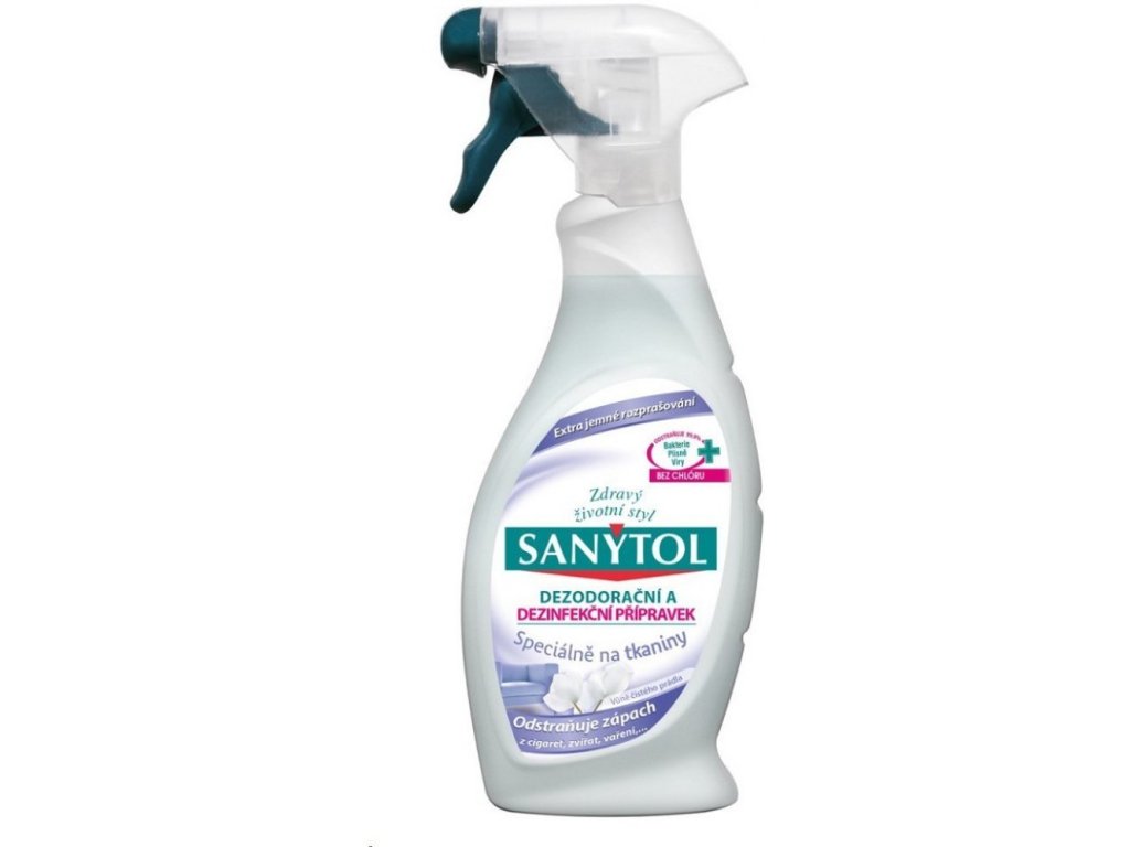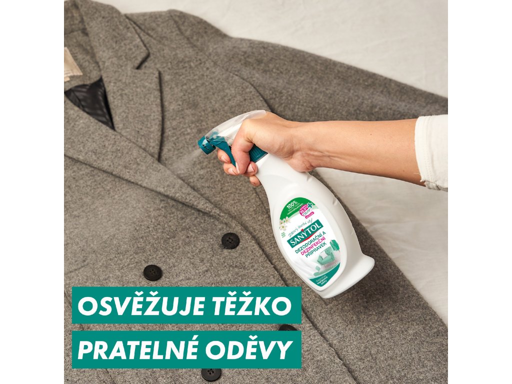 Dezodorační a dezinfekční přípravek SANYTOL účinně zbavuje textilie zápachu a zároveň dezinfikuje bez použití chlóru. Díky složení se 100% aktivními složkami rostlinného původu proniká hluboko do vláken, kde ničí až 99,9 % bakterií, virů a plísní, včetně lidského koronaviru 229E a viru chřipky A H1N1. Přípravek je ideální pro osvěžení a hygienu tkanin, které nelze prát, jako jsou závěsy, čalounění, koberce nebo interiéry vozidel. Navrací látkám vůni čistého prádla, je dermatologicky testován a nezanechává na textiliích žádné agresivní zbytky.