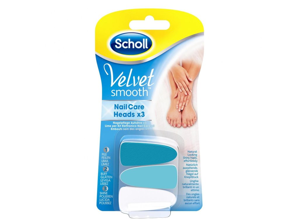 Náhradní hlavice SCHOLL Velvet Smooth jsou určeny pro elektrický pilník na nehty rukou i nohou a tvoří kompletní systém pro profesionální péči o nehty v domácím prostředí. V balení najdete tři barevně rozlišené hlavice, které slouží ke třem krokům péče: pilování, broušení a leštění nehtů. Tmavě modrá hlavice upravuje tvar nehtů, světle modrá vyhlazuje povrch a bílá jim dodává přirozený lesk. Pravidelné používání pomáhá předcházet lámání a třepení nehtů a zanechává je zdravé, pevné a upravené – bez nutnosti použití laku.