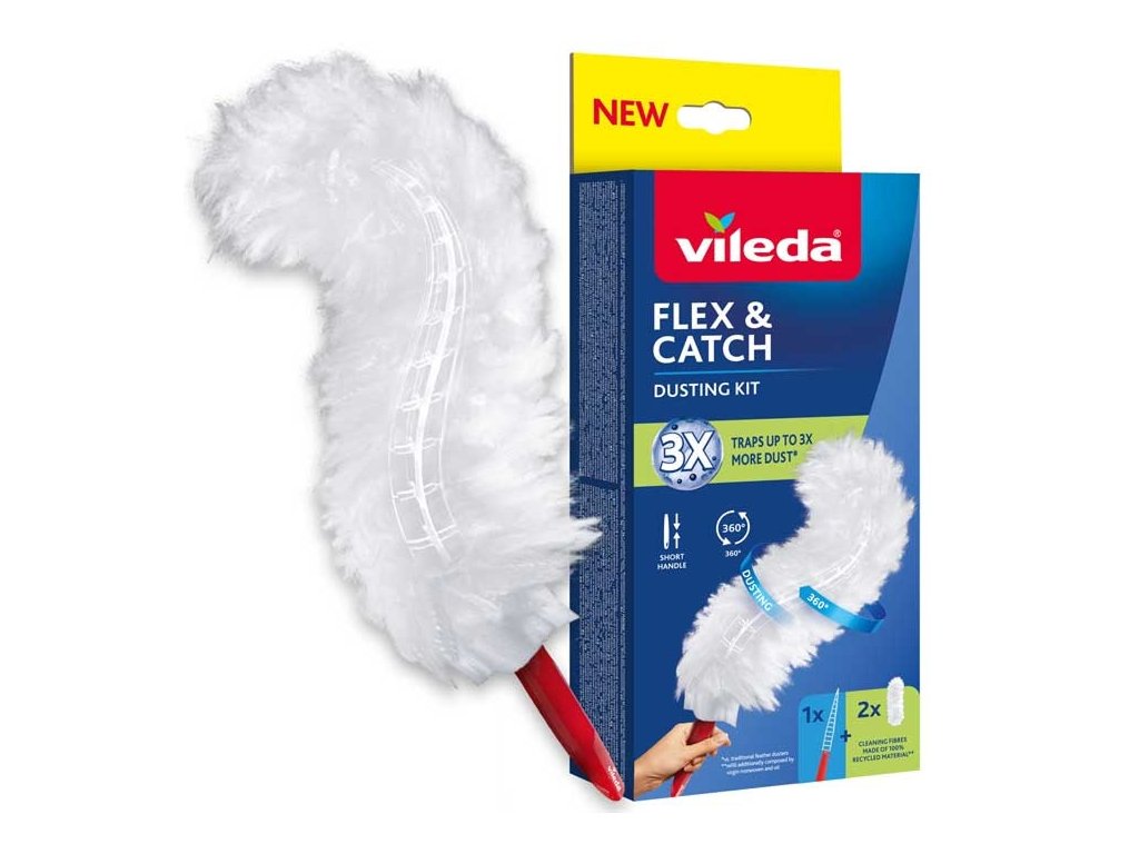 S prachovkou VILEDA Flex & Catch odstraníte prach z každého kouta rychle, důkladně a bez zbytečné námahy. Díky ohebné hlavici a 360° vláknům z recyklovaného materiálu zachytí až 3x více prachu než běžné péřové prachovky. Nečistoty se tak nevíří po místnosti, ale skutečně se odstraní – pro čistší domov každý den.