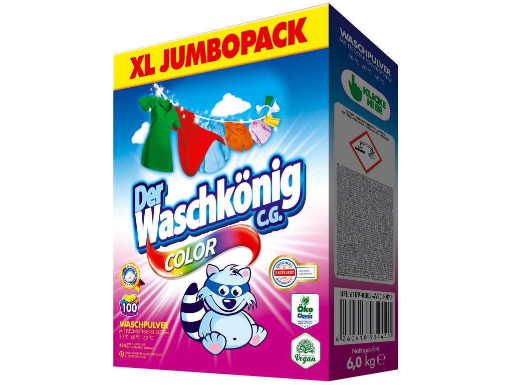 WASCHKÖNIG Color je prací prášek určený pro barevné prádlo, který poskytuje silný čisticí účinek už od 30 °C a současně chrání barvy před vyblednutím. Dobře se rozpouští ve vodě, nezanechává zbytky na tkaninách a zanechává prádlo svěže provoněné. Díky obsaženým složkám napomáhá omezovat tvorbu vodního kamene, takže není nutné používat další odvápňovací prostředky. Prášek je vhodný pro každodenní praní běžných textilií a vystačí až na 100 pracích dávek. Není vhodný pro vlnu a hedvábí.